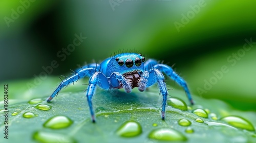 © Anna, Fototapeta premium Vibrant blue jumping spider on dew-covered leaf in close-up nature view