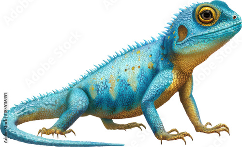 © ABDUL, Fototapeta premium Vibrant blue lizard with yellow spots and spiky scales isolated on transparent background