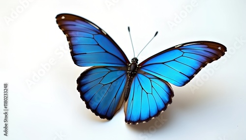 Fototapeta premium Vibrant blue morpho butterfly with intricate wing details, showcased against a clean white background. A stunning display of nature's artistry.