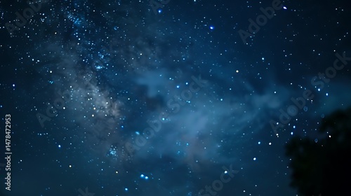 © atar, Naklejka premium Vibrant Blue Night Sky With Bright Stars And Milky Way Above Landscape