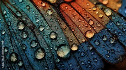Fototapeta premium Vibrant Blue Orange Bird Feathers Detailed Macro Shot Water Drops Jewel Tones...
