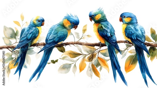 © Nirut, Obraz premium Vibrant Blue Parrots on Branch with Watercolor Leaves Tropical Bird Artwork