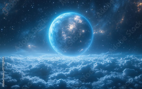 © ali, Fototapeta premium Vibrant Blue Planet Surrounded by Rings in Cosmic Landscape Illuminated by Distant Stars