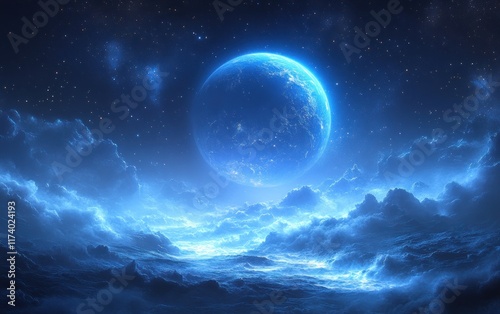 © ali, Fototapeta premium Vibrant Blue Planet Surrounded by Rings in Cosmic Landscape with Stars