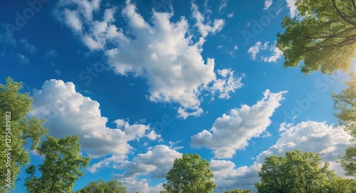© The 2R Artificiality, Obraz premium Vibrant Blue Sky With Fluffy Clouds Framed By Lush Green Trees Ideal For Nature Themes Or Text Overlay Usage