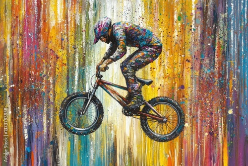 Fototapeta premium Vibrant BMX Rider in Mid-Jump Against Colorful Background