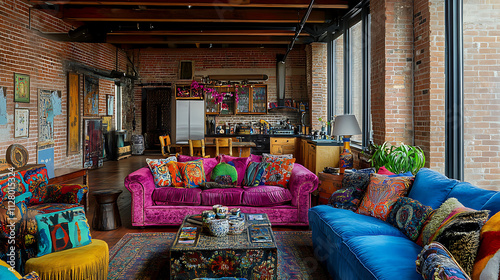 © Chonthicha, Obraz premium vibrant Bohemian style living room with eclectic decor and colorful sofas