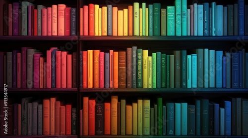 © DreamStock, Fototapeta premium Vibrant Bookshelves Displaying Colorful Books Arranged in Rainbow Order Against Dark Background