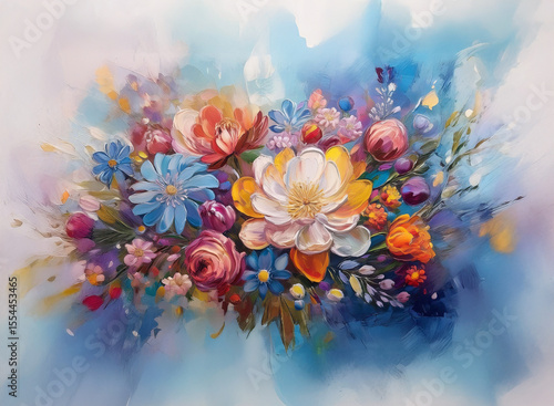 © Echo of Dreams, Obraz premium Vibrant bouquet of colorful flowers against a soft, blue and purple watercolor background. The painting showcases a variety of blooms in diverse hues and textures.