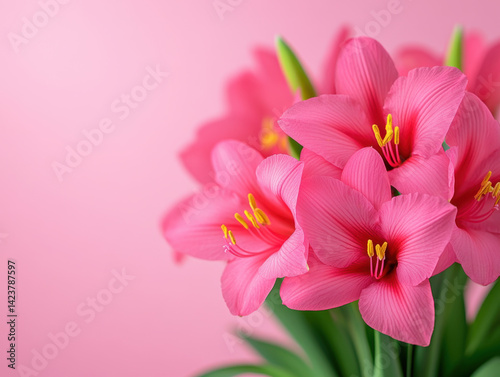 Fototapeta premium vibrant bouquet of pink hippeastrum flowers stands out against soft pink background, showcasing their delicate petals and bright yellow stamens, evoking sense of joy and beauty