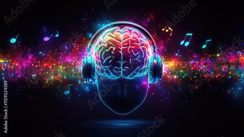 Obraz premium Vibrant brain with headphones and musical notes in neon colors