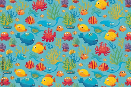© Michael, Naklejka premium Vibrant Bright Cartoon Aquatic Sea Life Pattern for Kids' Playful Backdrop