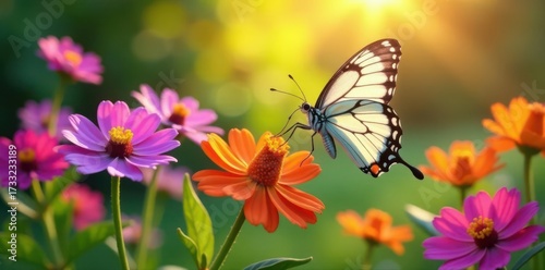 Naklejka premium Vibrant butterflies flitting among colorful blooms in a sunlit garden ,...