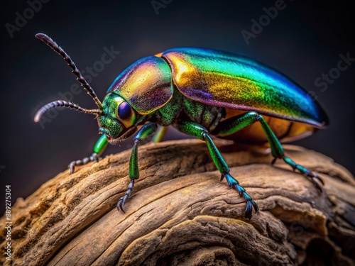 © Sirinporn, Naklejka premium Vibrant butterfly beetle with iridescent wings perched on gnarled root in studio setting, isolated on dark background with ample copy space on right side.