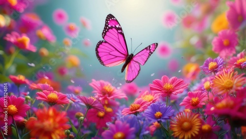 Naklejka premium Vibrant butterfly hovering above colorful flowers in a lush garden during spring