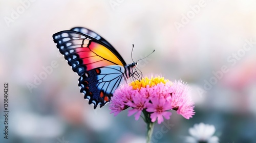 Fototapeta premium Vibrant butterfly on a delicate pink flower