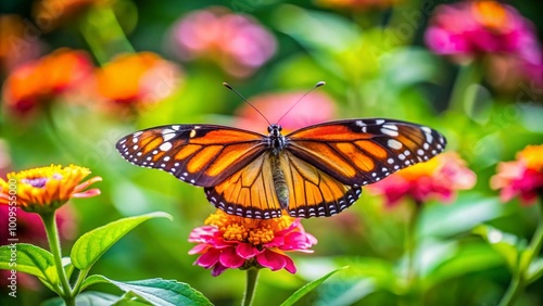 Naklejka premium Vibrant Butterfly on a Flower Petal in a Lush Green Garden Under Bright Sunlight