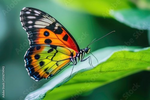 © Divine123victory, Naklejka premium Vibrant Butterfly on a Leaf, Close-up