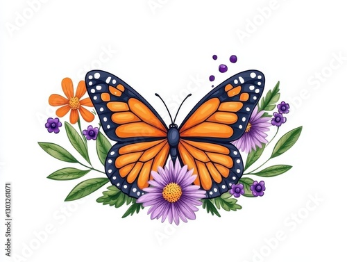 Fototapeta premium Vibrant butterfly perched among colorful flowers in a serene garden setting