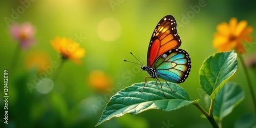 Fototapeta premium Vibrant butterfly perched on a lush green leaf in a sunlit garden