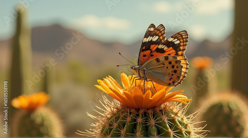 Obraz premium Vibrant butterfly sips nectar from bright desert cactus bloom, showcasing...