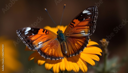 Obraz premium Vibrant butterfly wing in macro, pollinating a yellow flower outdoors generated by AI