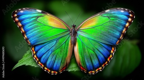 Obraz premium Vibrant butterfly with iridescent blue and green wings resting on a leaf