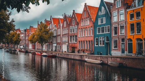 © Kopgz-41, Fototapeta premium Vibrant Canalside Homes: A Picturesque Row of Colorful Houses