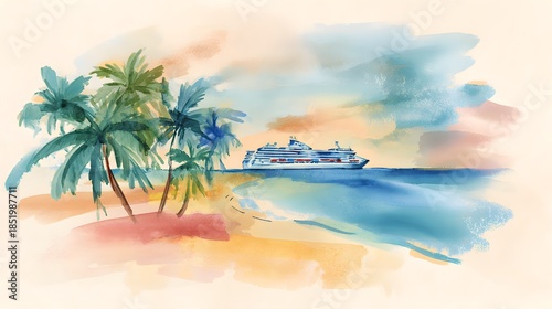 Fototapeta premium Vibrant Caribbean Beach Watercolor Illustration Cruise Ship Serene Summer Holiday Scene Stock Image