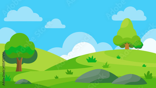 © Rashada, Obraz premium Vibrant cartoon landscape with rolling green hills and fluffy clouds