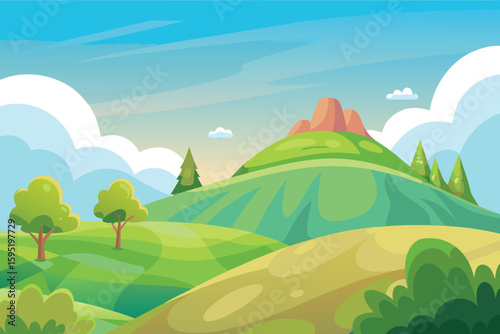Obraz premium Vibrant cartoon landscape with rolling hills and mountain peak