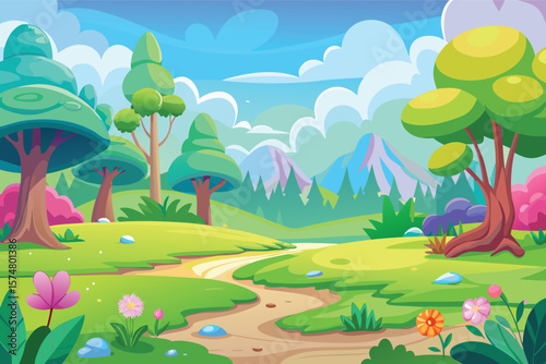 © BB123, Obraz premium Vibrant cartoon landscape with winding path and colorful mountains