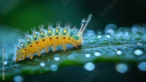 © Aris, Naklejka premium Vibrant caterpillar crawling on a dew-covered leaf.