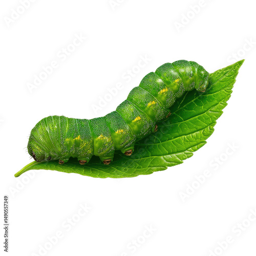 © MANGKORN, Naklejka premium Vibrant Caterpillar on Leaf: A captivating close-up view of a vivid green caterpillar gracefully resting on a lush green leaf, showcasing the wonders of nature and the beauty of wildlife.