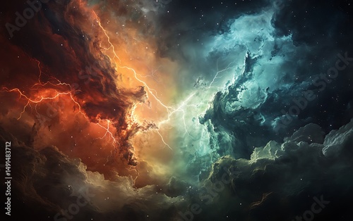 © Creative Design , Obraz premium Vibrant celestial clouds with striking lightning reveal the universe's beauty in a contrasting celestial display