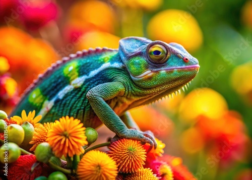 © kansak01, Fototapeta premium Vibrant Chameleon Camouflaging Among Colorful Blooms - Tilt-Shift Photography for Nature Lovers, Wildlife Enthusiasts, and Floral Aficionados