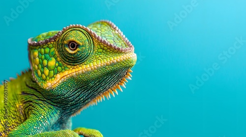Fototapeta premium Vibrant Chameleon on Blue Background in Studio Setting