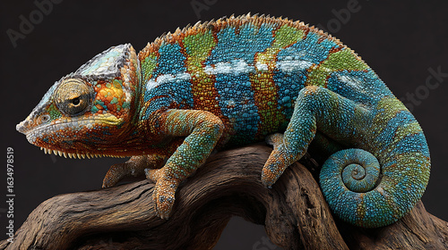 © Rashed, Obraz premium Vibrant chameleon perched on weathered wood reptile colorful