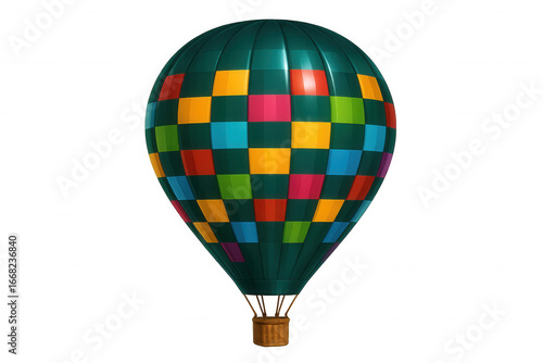 © PNG Kingdom , Naklejka premium Vibrant checkered hot air balloon drifting serenely, symbolizing boundless exploration and aerial freedom against pristine backdrop