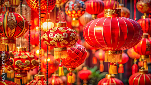 Naklejka premium Vibrant Chinese New Year decorations including red lanterns, paper cuttings,...