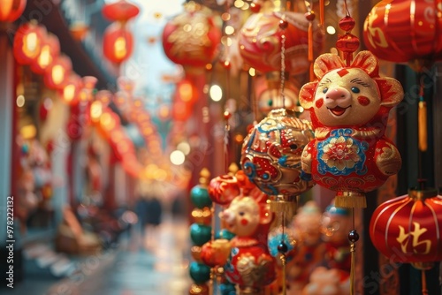 © Phoenix AI Photo, Naklejka premium Vibrant Chinese New Year decorations with red lanterns and festive ornaments create a joyful atmosphere in a traditional market street.