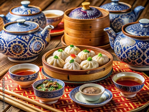 Fototapeta premium Vibrant Chinese table setting with ornate porcelain, steaming dumplings, and...