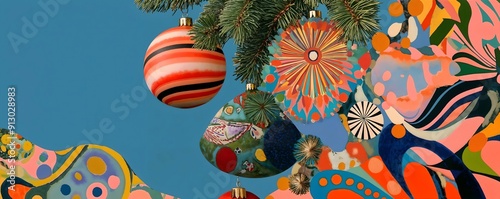 © Alla, Fototapeta premium Vibrant Christmas Tree Branches with Colorful Ornaments and Decorations on a Retro Vibrant Background in 60s Design Style. Creating a Festive and Cheerful Holiday Scene Banner.
