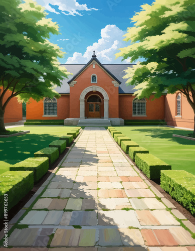 © NguyenThi, Fototapeta premium Vibrant Church Courtyard with Manicured Lawn and Colorful Tiled Pathway
