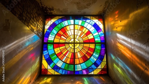 Obraz premium Vibrant circular stained glass window illuminating colorful light in rustic room.