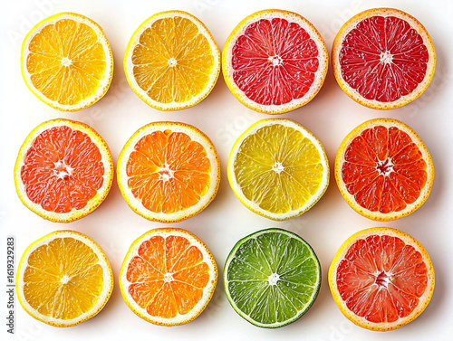 © Jeerawat, Fototapeta premium Vibrant Citrus Fruit Slices Displayed on White Surface for Freshness