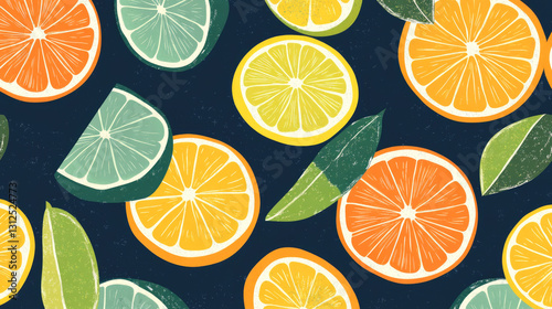 Obraz premium Vibrant citrus pattern with orange, lemon, and lime slices on dark background