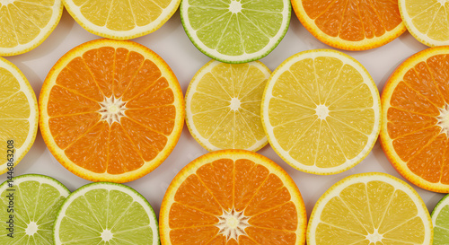 © Firyal Affina, Obraz premium Vibrant Citrus Slices: Oranges, Lemons, and Limes Flatlay