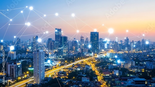 Obraz premium Vibrant city at night with showcasing interconnected network technological...