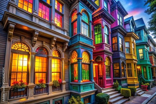 Naklejka premium Vibrant City House Windows Panoramic View - Colorful Architecture Photography